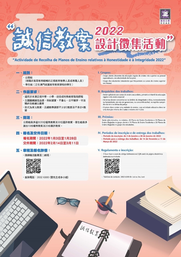 廉政公署举办“诚信教案设计征集活动2022”,持续推动社会关注诚信教育,促进教育专业交流及提升诚信教学设计的质量,欢迎全澳教学人员和就读澳门高等教育课程的学生报名参加,报名期为2022年1月3日至28日。