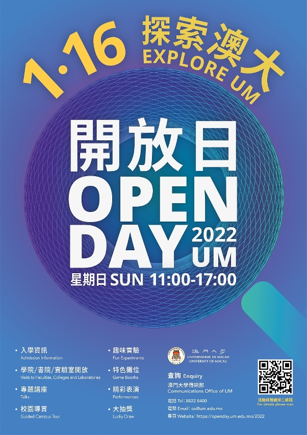 澳门大学将于1月16日(星期日)举行“探索澳大开放日”,届时将有入学咨询、讲座、参观国家重点实验室、亲子互动等精彩活动,让大家探索澳大前沿科研和多姿多彩的校园生活。欢迎全澳市民、学生、家长和游客参与。