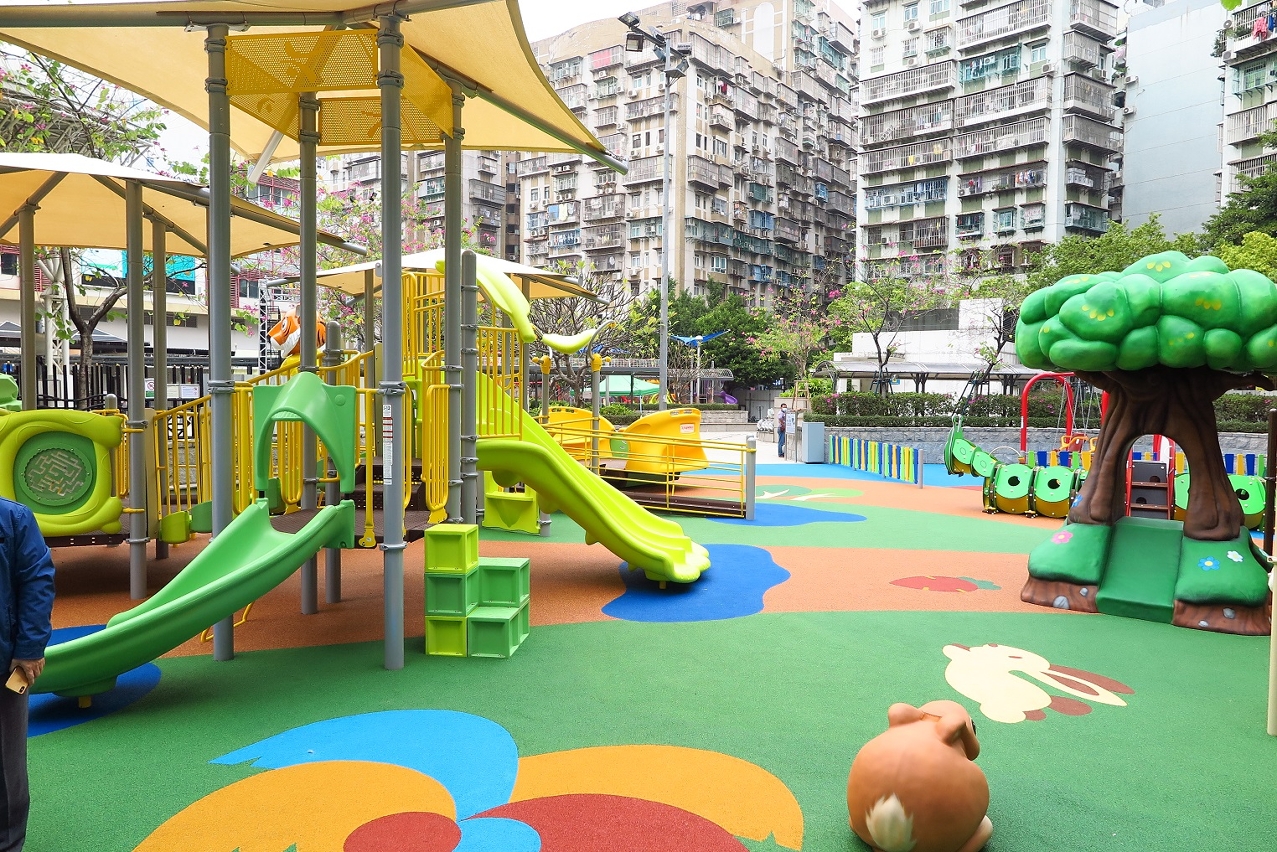 佑汉街市公园内两儿童游乐场已使用多年,设施残旧老化,故于去年底开展园内两个儿童游乐场之整体优化工程;将靠近永添新邨的儿童游乐场由原来的二百六十六平方米扩大至二百八十平方米;而靠近美莲大厦的儿童游乐场则改为共融游乐场。两个游乐场引入了新颖有趣及不同年龄层的游戏设施,以满足各年龄段的儿童需求。另外,亦翻新遮阳棚及遮阳长廊、更换照明系统为LED节能灯具等。