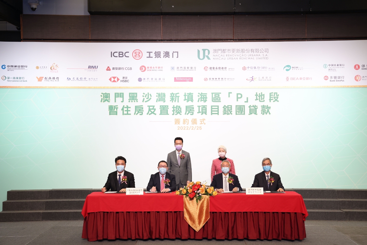 「黑沙湾新填海区『P』地段暂住房及置换房项目银团贷款签约仪式」今(25日)举行,澳门都市更新股份有限公司(下称:都更公司)与中国工商银行(澳门)股份有限公司(下称:工银澳门)代表签署合同,以银团贷款融资方式建设项目。