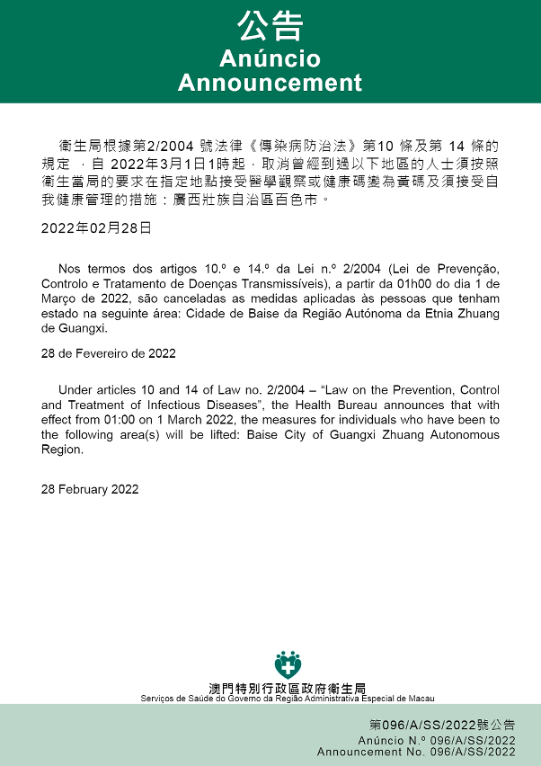 新型冠状病毒感染应变协调中心(下称应变协调中心)宣布,因应内地的疫情变化,卫生局根据第2/2004号法律《传染病防治法》第10条和第14条的规定,自2022年3月1日凌晨1时起,所有曾经到过以下地点的入境及已入境人士,须按照卫生当局的要求在指定地点接受医学观察至离开当地后14天但最短不少于7天:广东省中山市坦洲镇永一村头围队,深圳市南山区招商街道爱榕园、蛇口街道的雷公岭村、石云村、围仔西小区、米兰公寓二期,沙河街道汇雅苑,桂湾三路–十一号路–创新九街–怡海大道–桂湾三路围合区域(包括南山区南山街道龙海家园第1栋),南山街道华联城市中心,南头街道大新新村北区,龙华区大浪街道龙胜新村A区(一区);天津市滨海新区天津空港经济区雅苑足道。