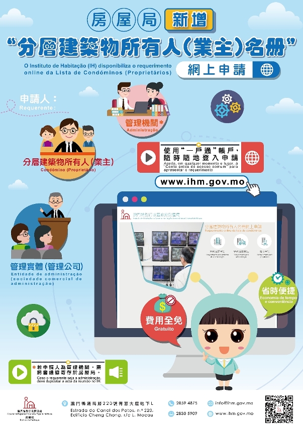 申请可由管理实体(管理公司)、管理机关或分层建筑物所有人(业主),于房屋局网上平台(网址:https://lc-app.ihm.gov.mo/),以 “一户通”的个人或实体帐户登入申请;倘申请人为管理机关,则需完成办理会议录寄存的手续后,方可使用上述电子服务。