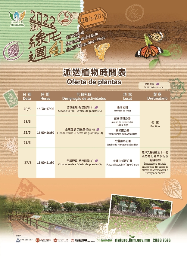如欲了解更多绿化周的资讯,可浏览市政署网页www.iam.gov.mo、澳门自然网或澳门绿化周专题网页http://nature.iam.gov.mo/greenweek2022,或致电2833 7676、2888 0087查询。
