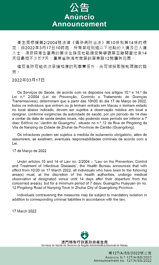 新型冠状病毒感染应变协调中心(下称应变协调中心)宣布,因应内地的疫情变化,卫生局根据第2/2004号法律《传染病防治法》第10条和第14条的规定,自2022年3月17日上午10时起,所有曾经到过以下地点的入境及已入境人士,须按照卫生当局的要求在指定地点接受医学观察至离开当地后14天但最短不少于7天:广东省珠海市南屏镇屏东路12号广珠花园。