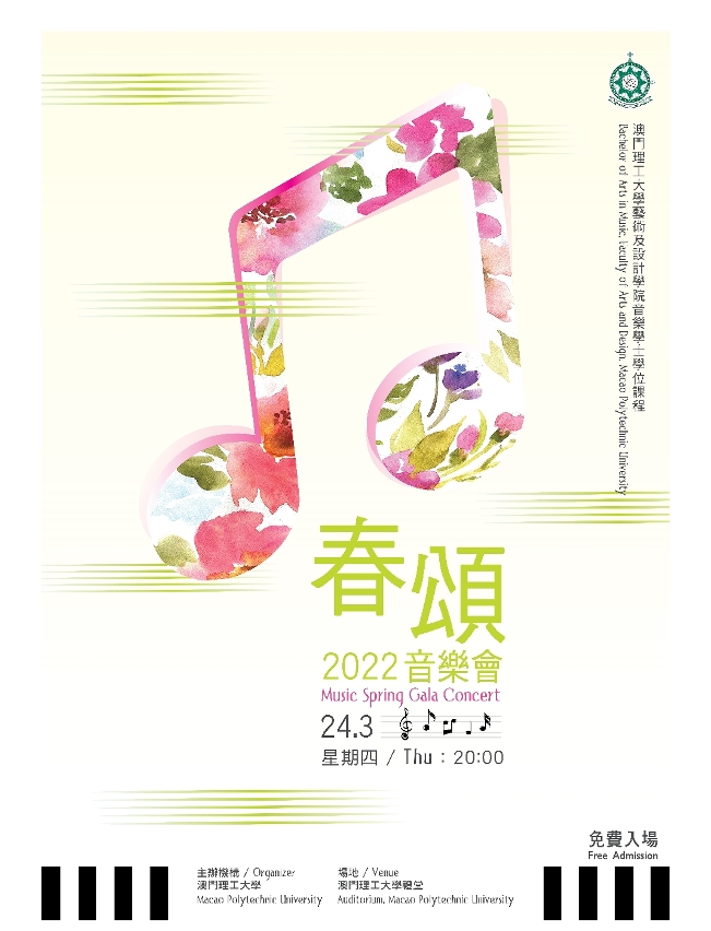 每年春季举行的“春颂”音乐会,寄语春天,展现青春,逐渐成为澳门理工大学艺术及设计学院音乐课程一年一度的品牌活动,演出节目丰富,形式多元,包括声乐演唱、中西器乐独奏及重奏等,让学生发挥潜能,尽展音乐才华。