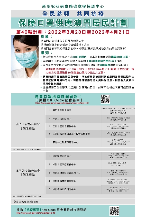 新型冠状病毒感染应变协调中心今(22)日公布,第40轮保障口罩供应澳门居民计划(下称“口罩计划”)于明(23)日开始,售卖期间为30日,即2022年3月23日至2022年4月21日,期间每人可一次性购买30个口罩,售价合共24澳门元。卫生局协议药房、本澳2个社团(工联、妇联)继续提供售卖口罩服务。即全澳共有65个售卖点,服务时间详见附图。透过口罩计划购买的口罩,如有不合格或次货可退回卫生中心。