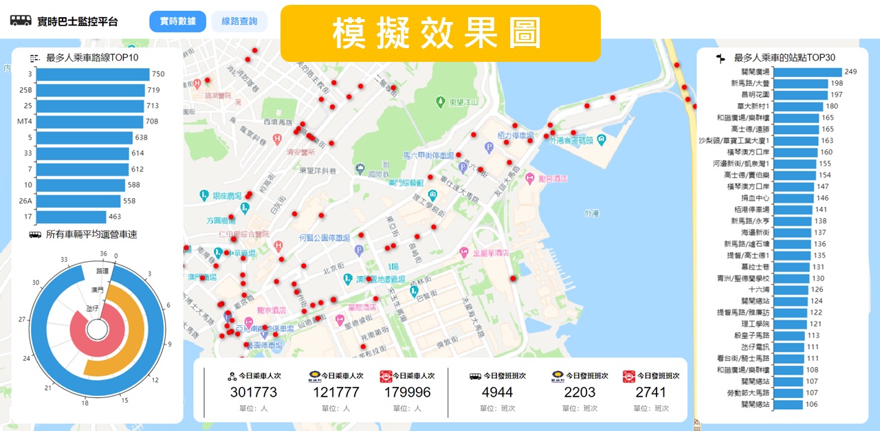 局方与两巴合作,升级全澳公共巴士上的车载机设备,收集巴士上利用电子支付方式(包括澳门通卡或MPay乘车码)的实时拍卡数据,并结合巴士管理系统的实时定位等数据,能够实时显示及推算各巴士路线及站点的客流情况。