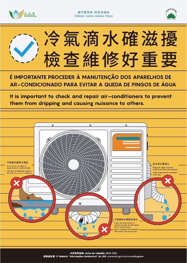 本澳近日天气炎热冷气机使用频率上升,市政署提醒市民,重新启用冷气机前应先检查排水喉管及底盘是否安装妥善,避免出现滴水情况。市政署将加强巡查冷气机滴水的违规情况,并加强灭蚊工作,以维护环境卫生。