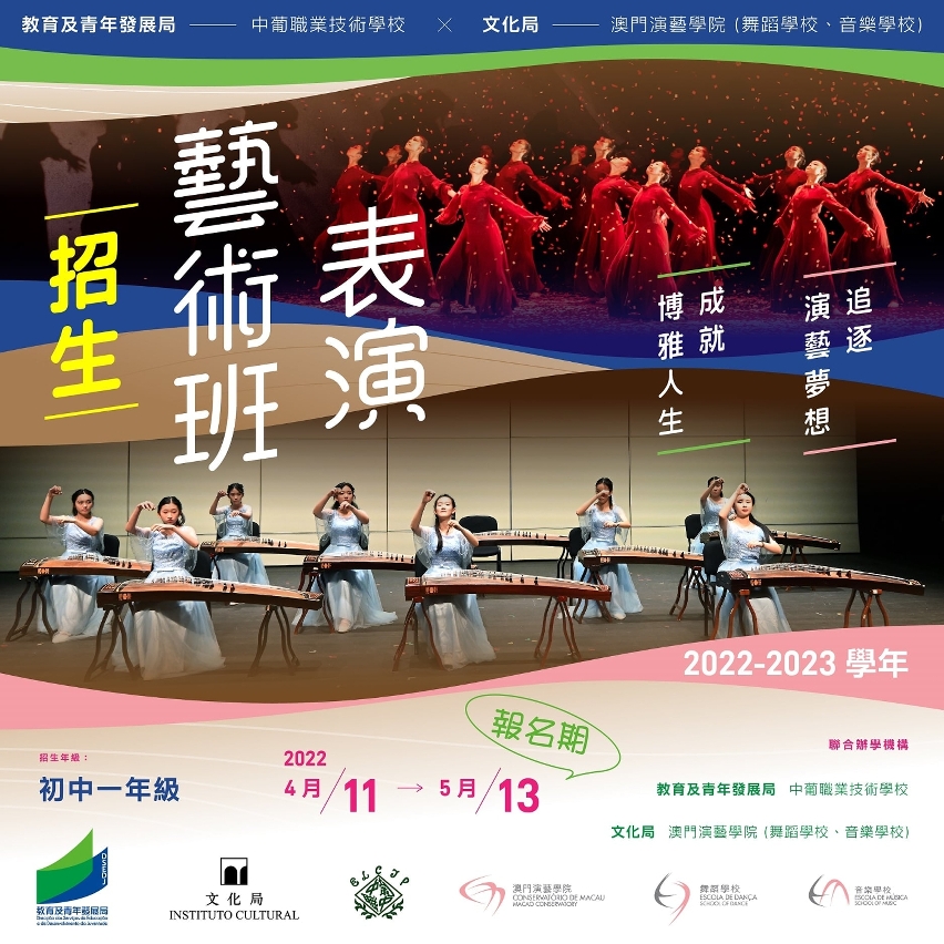 由教育及青年发展局与文化局联合开办的全新表演艺术课程,即日起至5月13日招收2022/2023学年初一年级新生。有关的中学艺术教育课程由教青局辖下的中葡职业技术学校联合文化局辖下的澳门演艺学院发挥资源优势,共同培养澳门表演艺术人才。欢迎对舞蹈、音乐表演艺术有兴趣的学生报名。