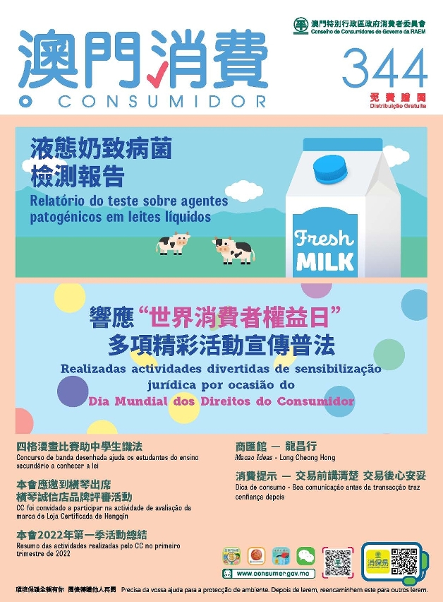 第344期《澳门消费》介绍消委会今年首季开展与完成的各项工作,包括举办各类型讲座及展览宣传《消保法》;与多个部门于节庆期间联合向商户普法;与粤港澳大湾区内地多个消费者组织合作,协同提高与加强彼此居民相互消费的信心与保障,促进两地融合消费。