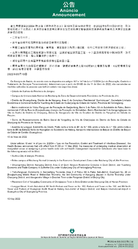 自2022年5月11日凌晨1时起,取消曾经到过以下地区的人士须按照卫生当局的要求在指定地点接受医学观察或健康码变为黄码及须接受自我健康管理的措施: