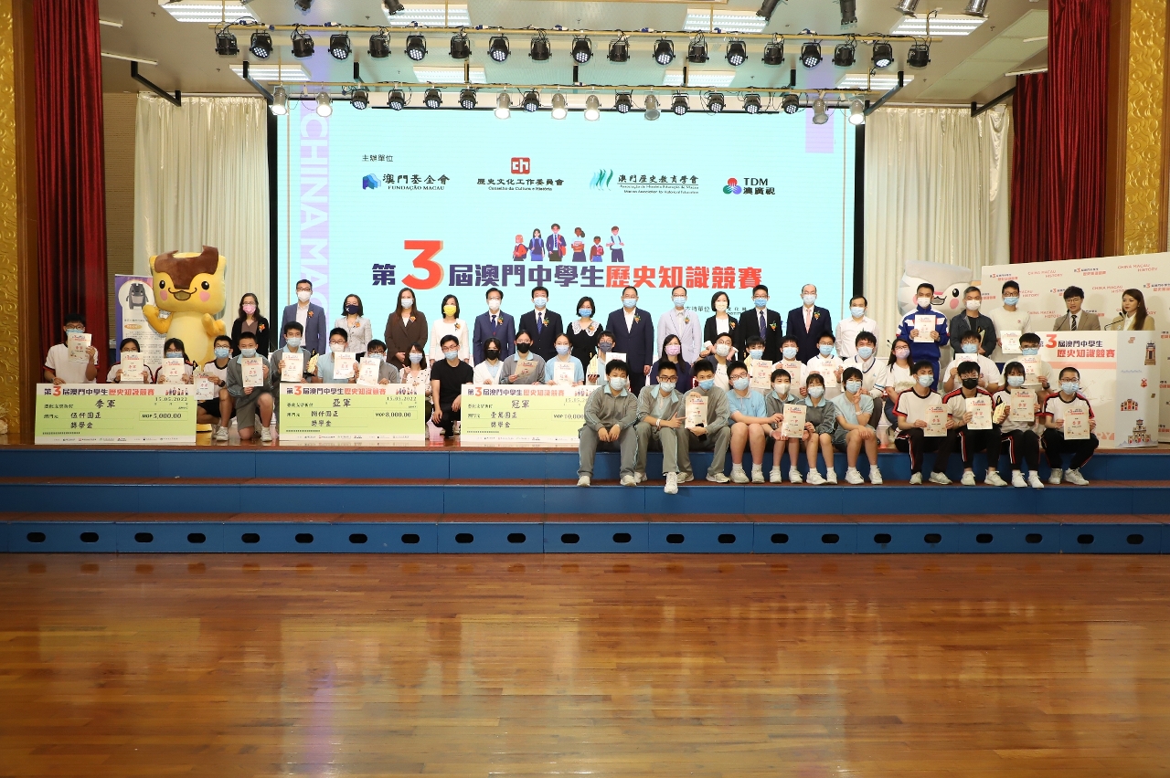 由澳门基金会及其历史文化工作委员会、澳门历史教育学会及澳门广播电视股份有限公司联合主办,文化局及澳门科技大学图书馆支持之“第三届澳门中学生历史知识竞赛”准决赛及决赛已于2022年5月15日(星期日)假濠江中学附属英才学校顺利举行,本届赛事共吸引了本澳33所学校、共151支队伍报名参加,反应相当踊跃。