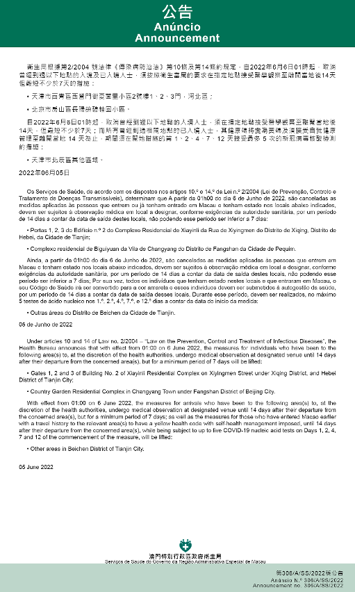 自2022年6月6日凌晨1时起,取消曾经到过以下地点的入境人士,须在指定地点接受医学观察至离开当地后14天,但最短不少于7天;而所有曾经到过相关地点的已入境人士,其健康码将变为黄码及须接受自我健康管理至离开当地 14 天为止,期间须在开始措施的第 1、2、4、7、12 天接受最多 5 次的新冠病毒核酸检测的措施:天津市北辰区其他区域。