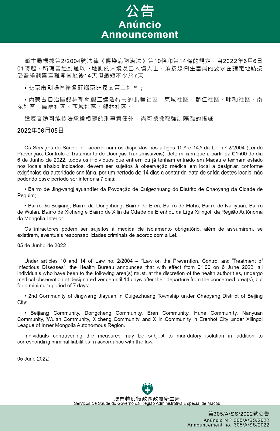 新型冠状病毒感染应变协调中心(下称应变协调中心)宣布,因应内地的疫情变化,卫生局根据第2/2004号法律《传染病防治法》第10条和第14条的规定,自2022年6月6日凌晨1时起,所有曾经到过以下地点的入境及已入境人士,须按照卫生当局的要求在指定地点接受医学观察至离开当地后14天但最短不少于7天: