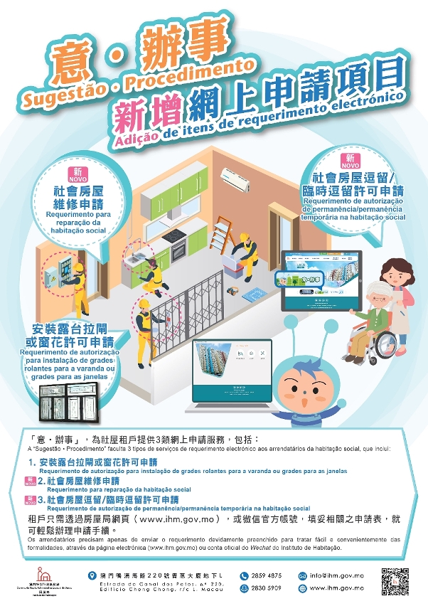 社屋租户只需于「意‧办事」网上平台(网址:https://ahs-app.ihm.gov.mo),输入简单的联络资料及选择所需服务,便可提交安装露台拉闸或窗花许可申请,或社屋维修申请;而社屋逗留/临时逗留许可申请则需承租人以个人“一户通”帐户登入办理。