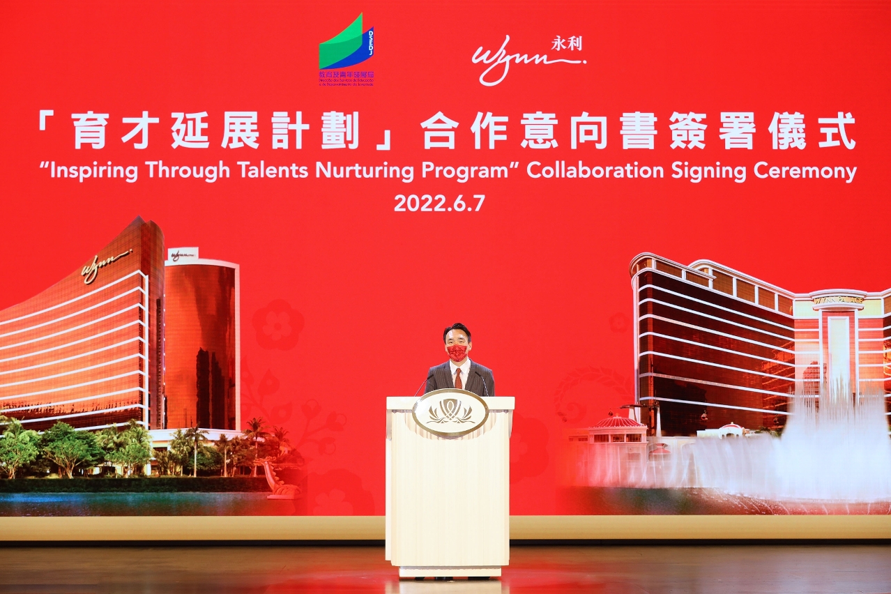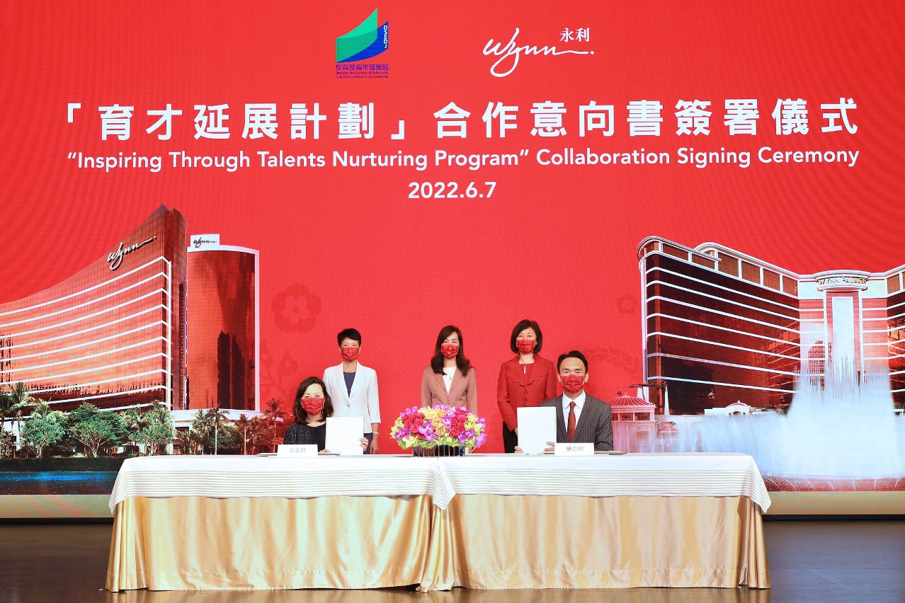 在社会文化司司长欧阳瑜、中央人民政府驻澳门特别行政区联络办公室教育与青年工作部部长徐婷以及永利渡假村(澳门)股份有限公司(以下简称“永利”)总裁兼常务董事陈志玲的见证下,教青局局长龚志明和永利澳门有限公司人力资源高级副总裁莫慕贤于2022年6月7日签订亲职教育方面的合作意向。
