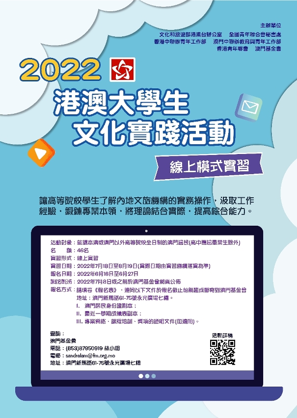由文化和旅游部港澳台办、全国青年联合会秘书处、香港中联办青年工作部、澳门中联办教育与青年工作部、香港青年联会及澳门基金会联合举办的2022年“港澳大学生文化实践活动”由6月16日至6月27日期间接受报名。