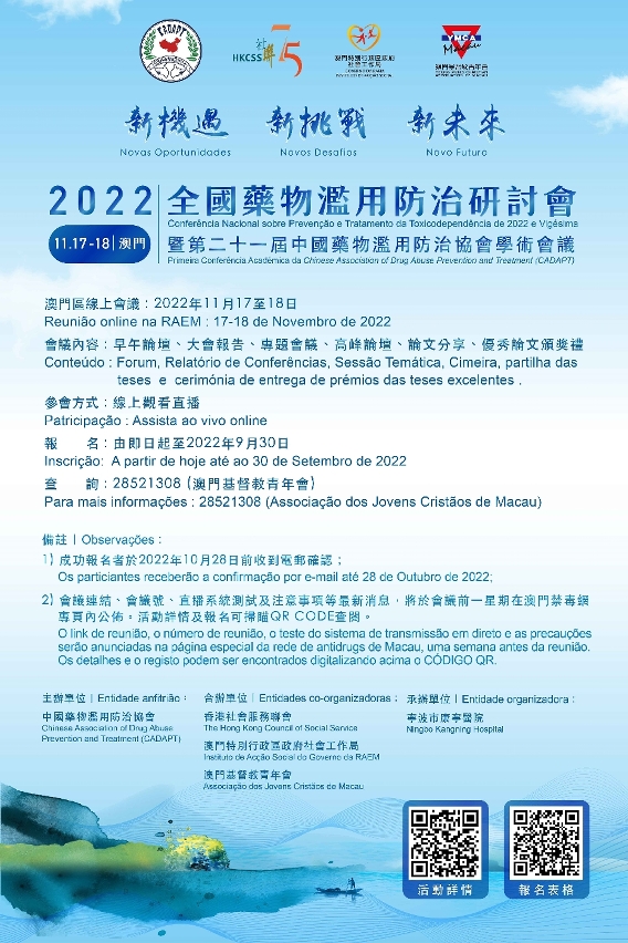 由中国药物滥用防治协会主办、澳门特别行政区政府社会工作局、香港社会服务联会及澳门基督教青年会合办的“2022年全国药物滥用防治研讨会”,将于11月17至18日在浙江省宁波市举行,港澳地区将以线上形式参会,现正接受报名。