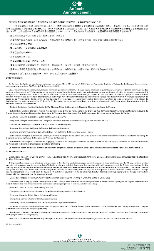 新型冠状病毒感染应变协调中心(下称应变协调中心)宣布,因应内地的疫情变化,卫生局根据第2/2004号法律《传染病防治法》第10条和第14条的规定,自2022年9月3日凌晨1时起,新增或取消对曾到内地相关区域人士的防疫措施:
