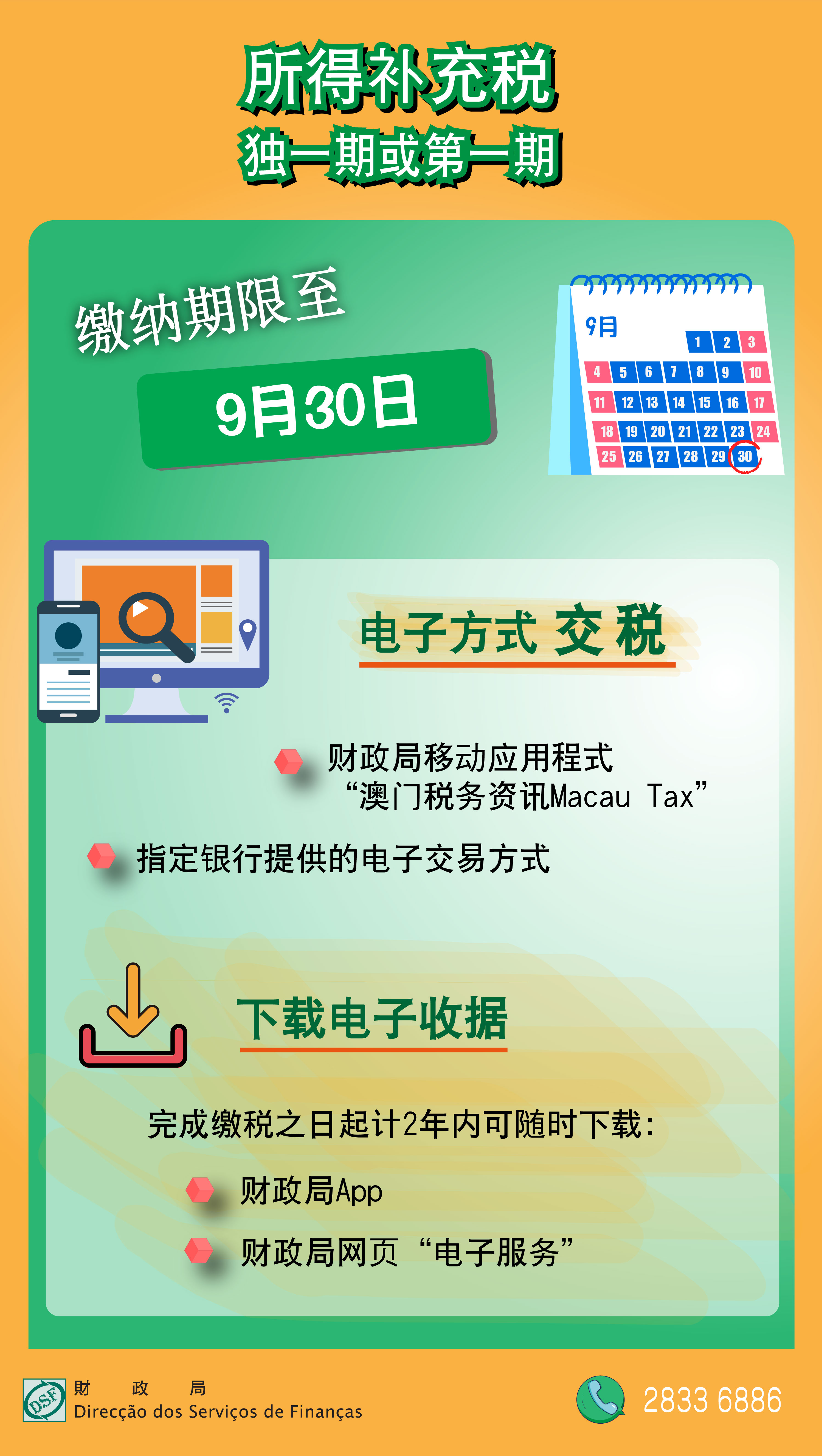 财政局提醒纳税人,缴纳月份为9月的独一期或第一期之所得补充税,缴纳期限至9月30日止,若第一期不按规定于9月份内缴纳,将加征过期利息及欠缴税款百分之三,并引致第二期立即到期。