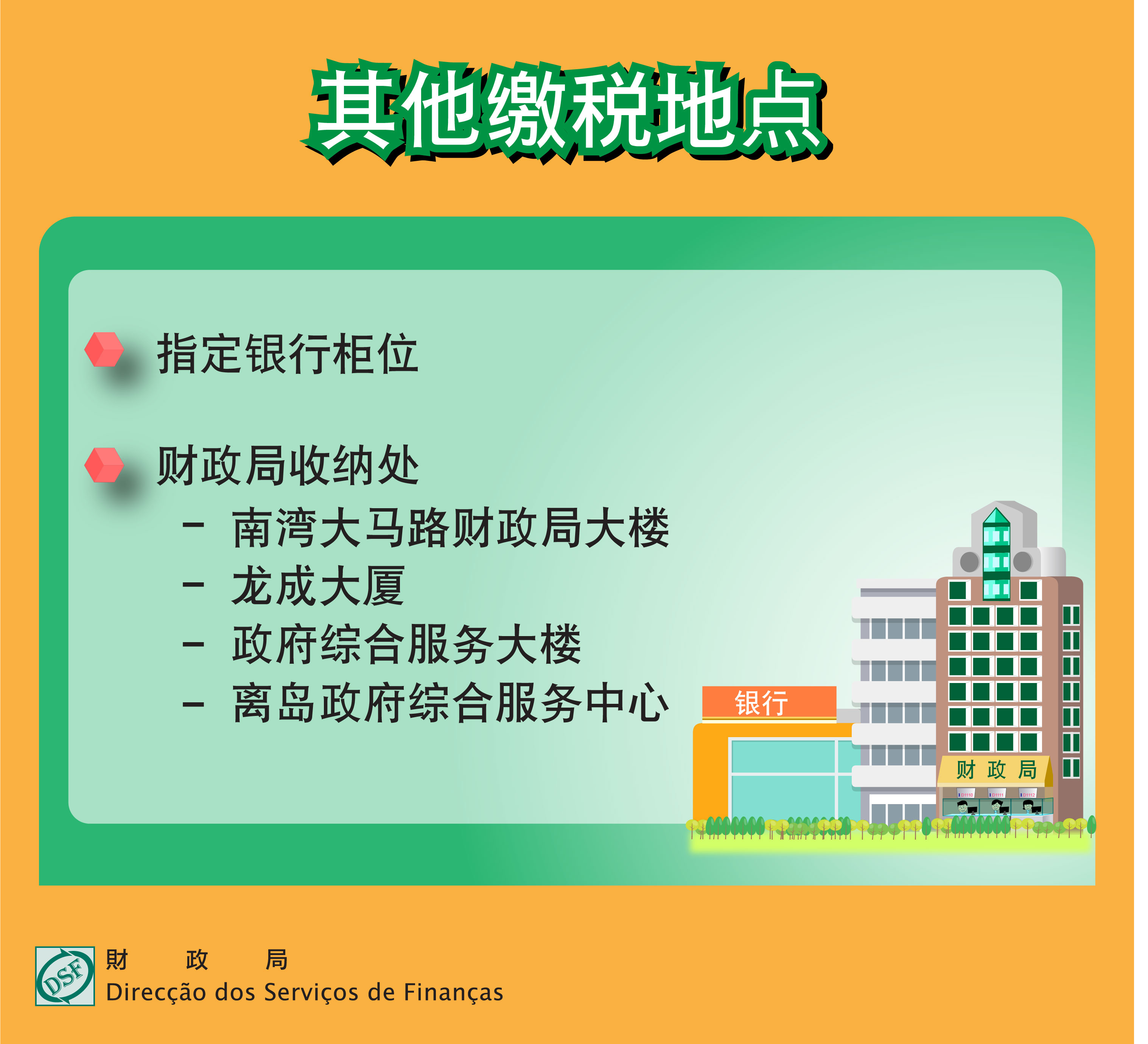 2. 前往财政局大楼、龙成大厦、政府综合服务大楼或离岛政府综合服务中心收纳处,办公时间如下: