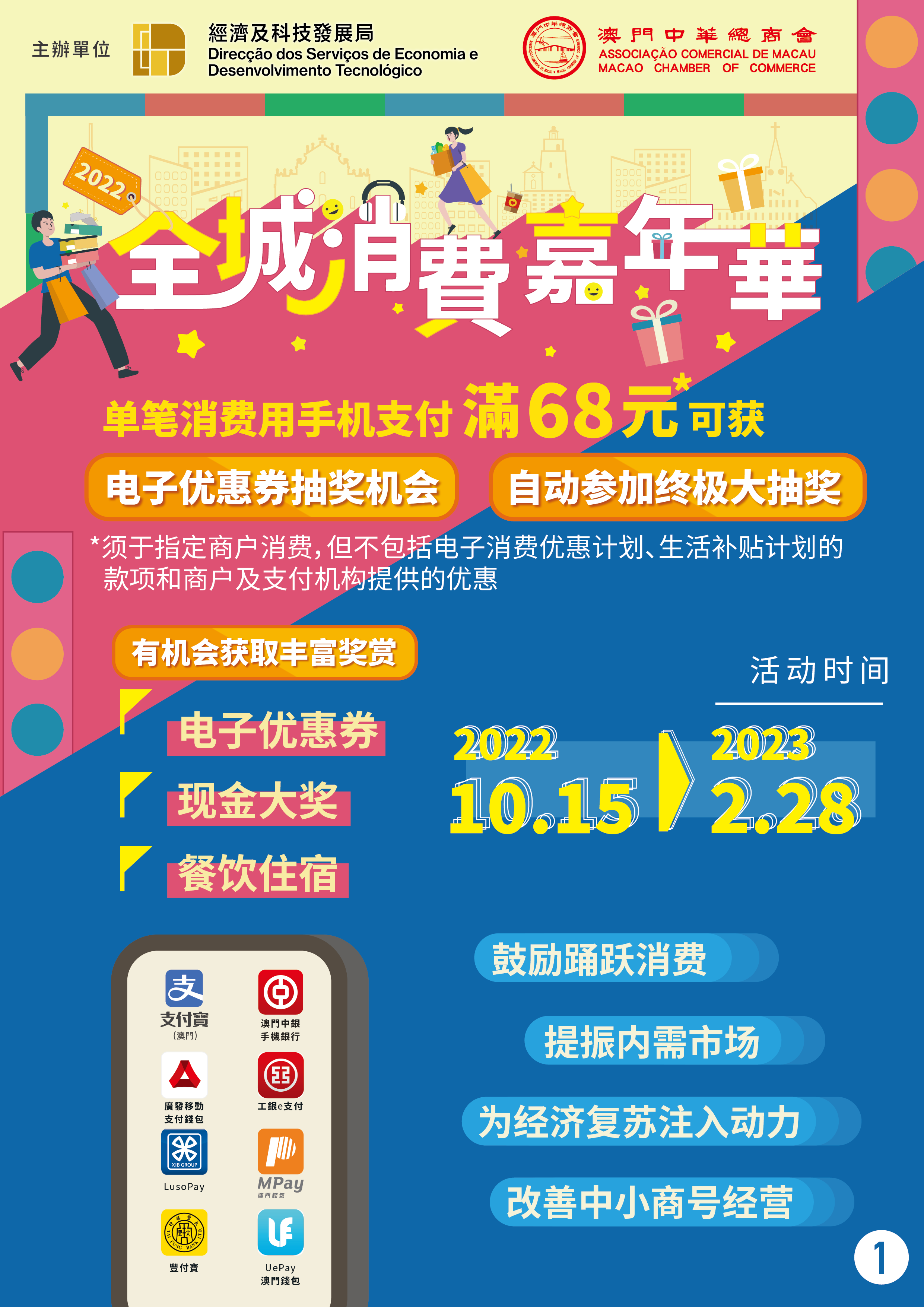“2022年全城消费嘉年华"将于10月15日正式推出,直至明(2023)年2月28日,活动为期长达20周。活动奖金奖品总值近1亿澳门元,活动期间,通过实名认证的电子钱包用户于全澳线下大部分实体店铺消费时,透过移动支付单笔实付满68元(澳门元,下同),即可获得抽奖机会获取电子优惠券,更可于活动结束后参加终极大抽奖。终极大抽奖奖品丰富,包括总值高达100万元现金、餐饮住宿等。