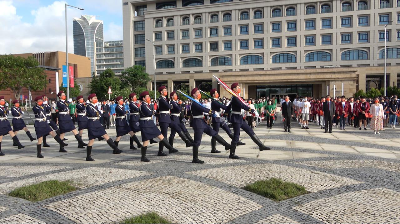 10月1日当天,澳大国旗仪仗队进行了“庆十一,贺华诞”升国旗仪式,队员以饱满的精神状态庆祝中华人民共和国成立73周年。伴随着雄壮的中华人民共和国国歌响彻莲花广场,国旗、区旗、校旗三面旗帜冉冉升起。现场人员庄严肃立向国旗行使注目礼,表达对伟大祖国的热爱和祝福。澳大副校长许敬文、学生事务长彭执中、各书院院长和副院长、学生资源处代处长张嘉茵及400多名澳大师生共同出席仪式。