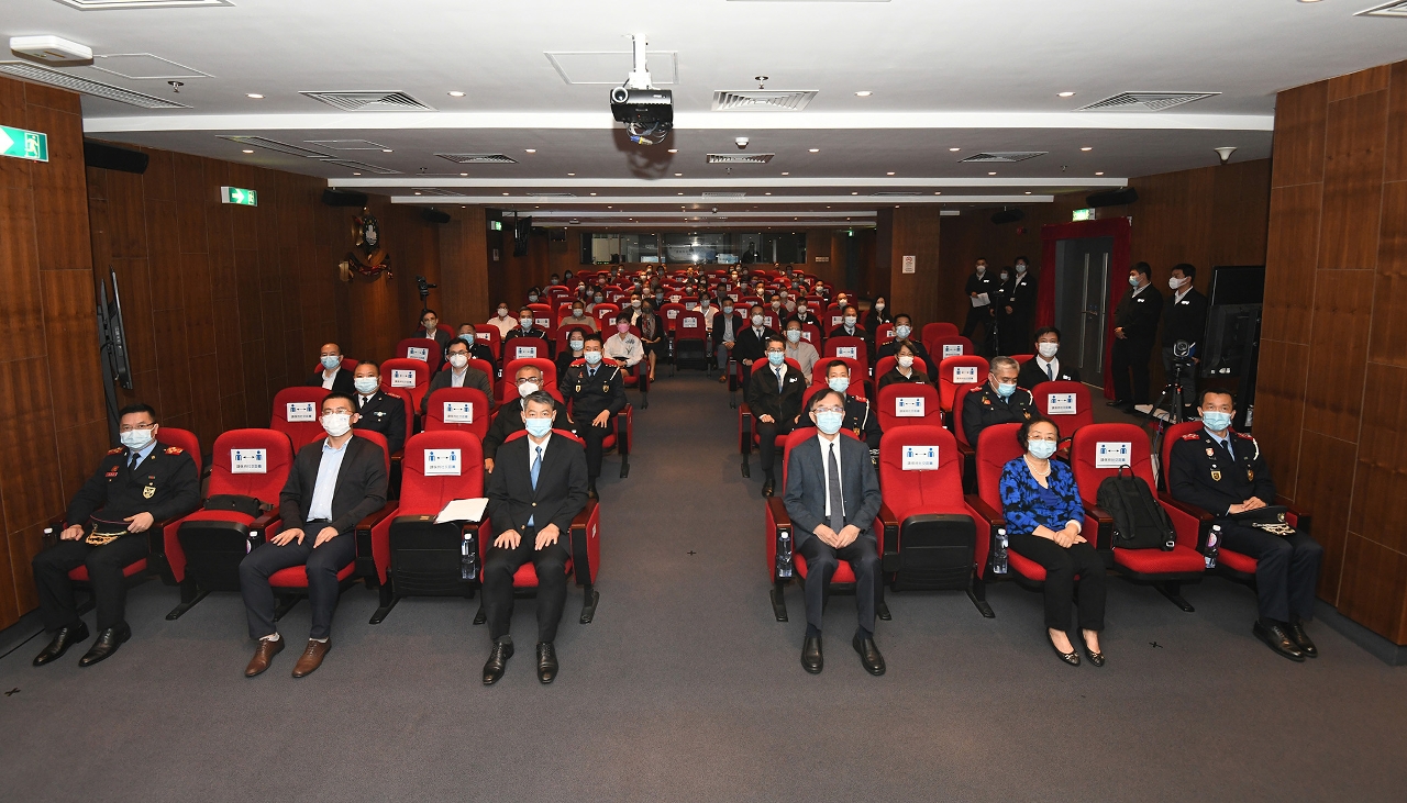 警察总局局长梁文昌联同民防架构成员代表、社区民防联络机制代表及民防志愿者于治安警察局出入境事务大楼一楼礼堂出席是次专题讲座,民防架构及社区民防联络机制成员同时设立了21个线上直播点,现场及线上参与人数逾500人。