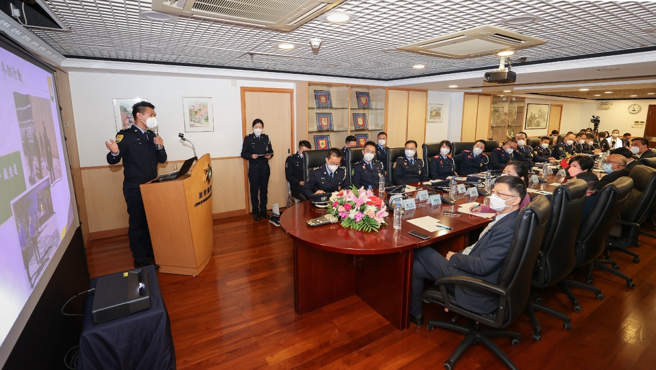接着,由治安警察局辖下策划行动厅、澳门警务厅、海岛警务厅、交通厅及出入境管制厅的警官代表,就各自范畴的工作情况进行了汇报。分别对治安警察局过去疫情防控的各项工作进行回顾、本澳各区去年治安状况及罪案数字、交通管理工作数据和新增交通措施及规划、出入境通关数据和新法规等进行整体介绍。另外,警官代表亦讲解各自范畴的冬防行动工作内容,包括警务行动及部署、新春期间节日活动的警力安排及防罪宣传等。