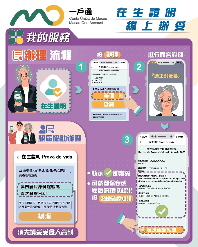 在身份证明局、社会工作局、社会保障基金、退休基金会及行政公职局的合作下,透过简化流程,整合部门数据,自2021年1月1日起,市民可透过“一户通”一次过办理上述3个部门6项服务的年度在生证明。同时,简易版亦向市民提供更简便的操作。