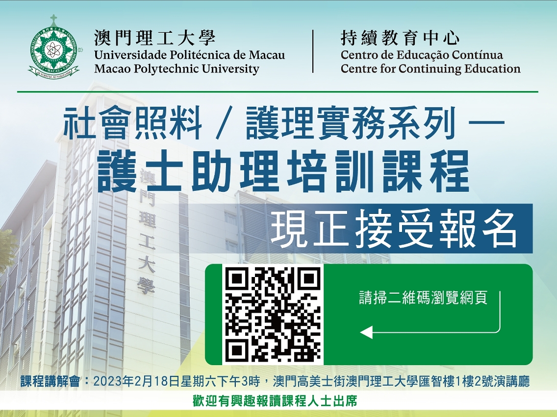 为配合特区政府社会文化司持续完善民生服务,提升居民生活素质施政方针,澳门医疗机构及院舍需要,培训护士助理,提升照顾者的知识、技能和态度,以保障照顾服务素质,澳门理工大学持续教育中心开办“护士助理培训课程”,为有志投身医疗护理机构健康照顾工作的人士提供培训。“护士助理培训课程”由澳门理工大学健康科学及体育学院教学人员、临床资深护士讲授护理理论与实务,特区政府卫生局支持临床实习。课程由即日起报名至2023年3月3日,并设有课程讲解会。