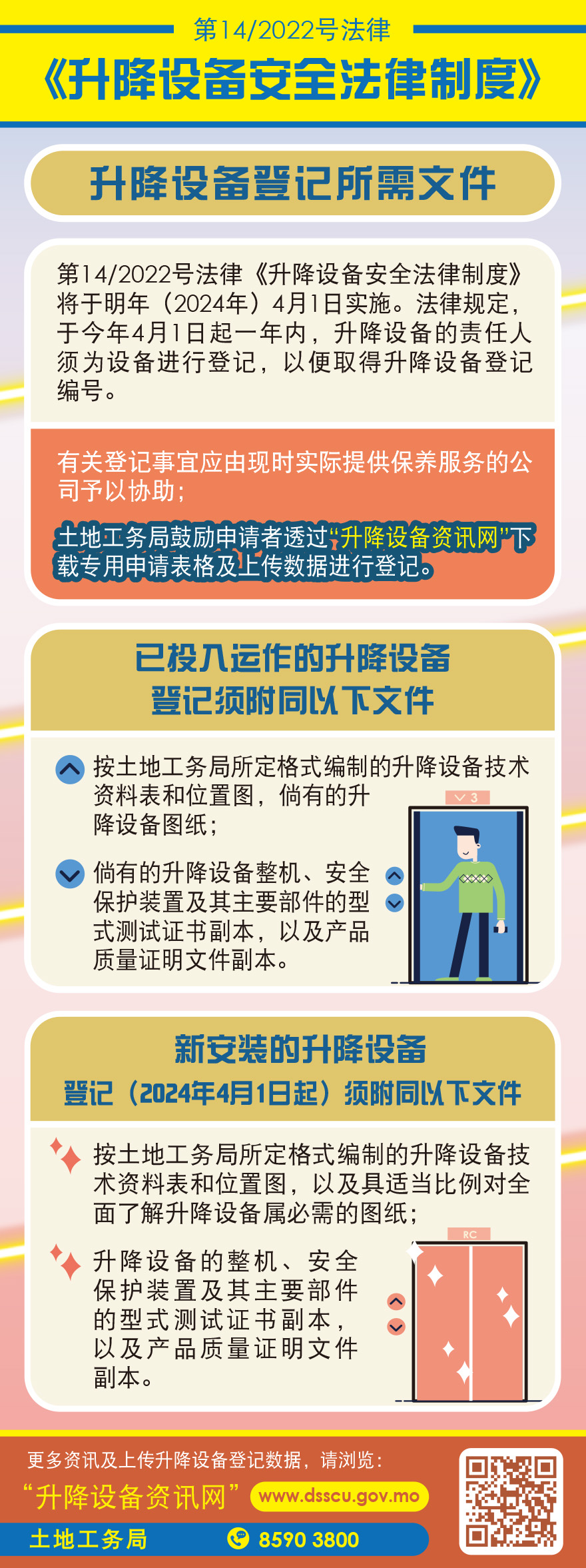土地工务局已开通“升降设备资讯网” (https://www.dsscu.gov.mo/zh_HANT/sites/ascensores),内容除包括升降设备相关法律资讯及宣传材料外,网站亦设有升降设备电子化登记功能,责任人可由保养实体协助下,透过网站填写及上传资料为升降设备进行登记申请,不受办公时间的限制。