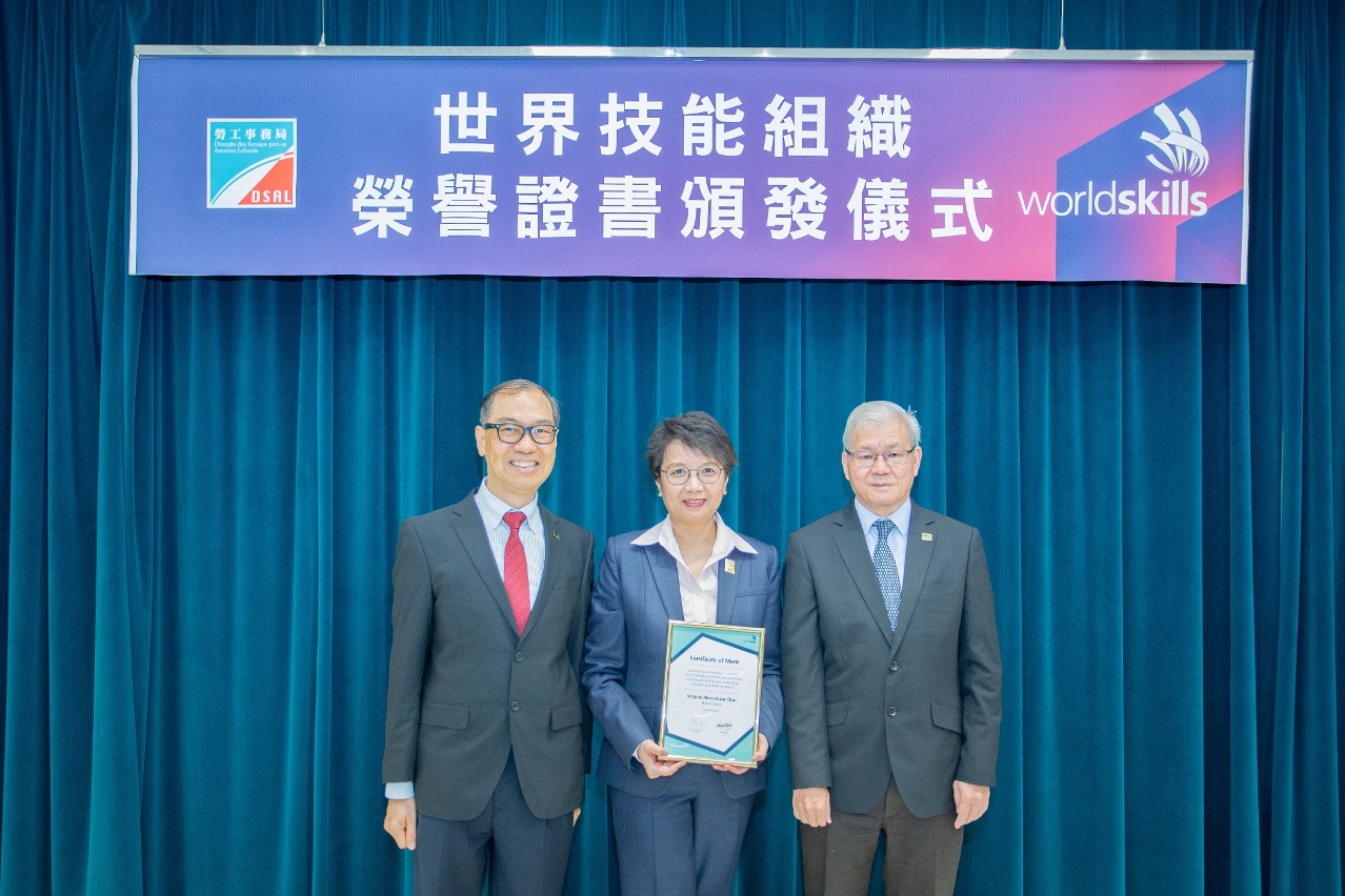 荣誉证书颁发仪式于3月27日在劳工事务局总办事处举行。劳工事务局局长黄志雄于致辞时表示,关治平女士为首位本澳代表获颁殊荣,对澳门职业技能发展的历程具有重要意义。期望未来继续为技能人才培训工作共同努力,培养产业多元发展所需的人才。