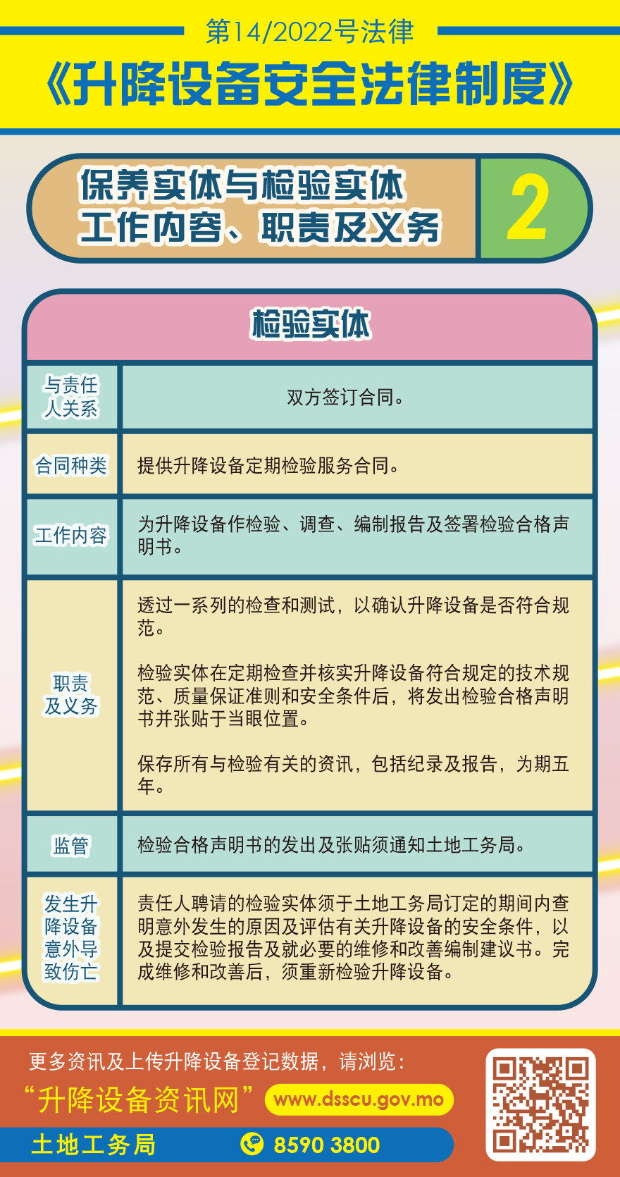 检验实体负责为升降设备作检验、调查、编制报告及签署检验合格声明书。根据规定,升降设备在完成登记投入运作前须作检验,其后也须由检验实体作每年一次的定期检验,透过一系列的检查和测试,以确认升降设备符合规范。在定期检查并核实升降设备符合规定的技术规范、质量保证准则和安全条件后,检验实体须发出及签署检验合格声明书,张贴于升降机内部当眼处或电动扶梯入口当眼处,并通知土地工务局。