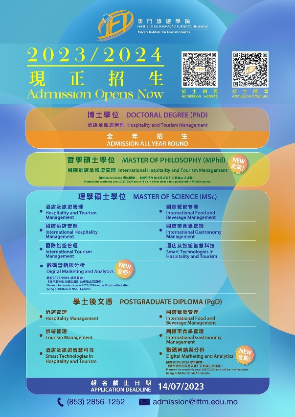 研究生课程设有奖学金。2023/2024学年学士后文凭课程及硕士课程现正招生,截止报名日期为2023年7月14日,博士课程则全年招生。可浏览澳门旅游学院招生网页 https://www.iftm.edu.mo/admission 了解详情。