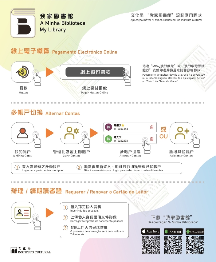 为推动智慧图书馆工作,流动应用程式“我家图书馆”已逐步增加线上办理读者证、多帐号切换及线上电子支付等功能,市民可透过电子支付平台线上支付逾期归还或赔书等费用,同时,一户通亦将新增“我的借书”功能,届时可更便捷市民使用公共图书馆服务,详情请留意行政公职局公布。