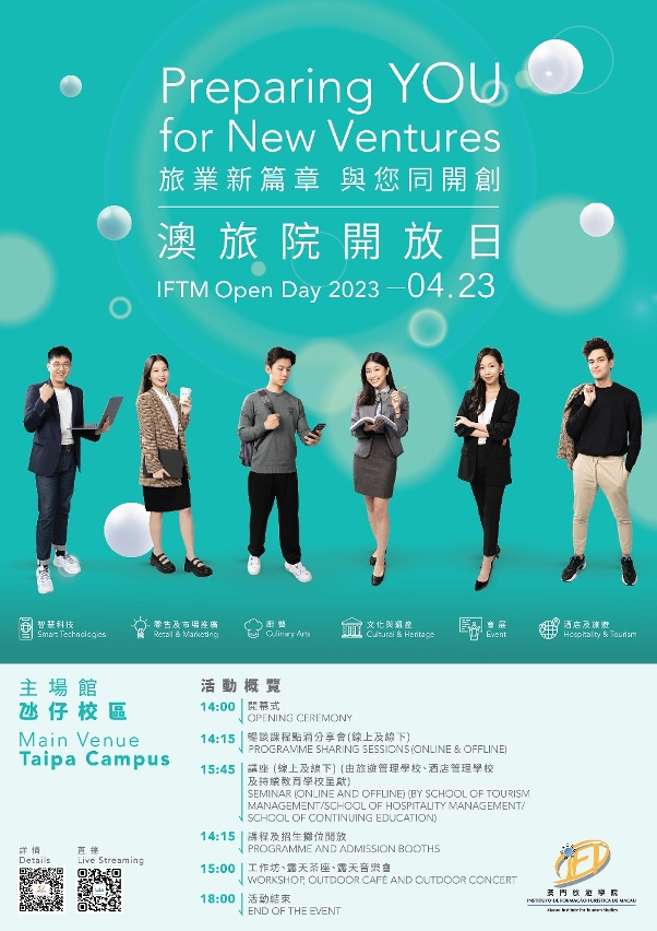澳门旅游学院将于4月23日举行开放日,透过不同的活动,加深澳门居民尤其是应届中学毕业生对澳门旅游学院及学院课程的了解。
