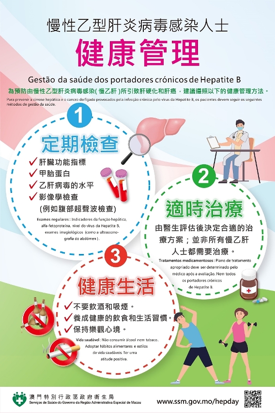 因应现时慢性乙型肝炎并没有根治的药物,患者在日常生活中要注意自我健康管理,避免病情进展成肝硬化和肝癌。为此,卫生局近年加强相关方面的宣传教育工作,包括多媒体宣传、健康讲座、健康推广活动等等,重点向患者宣传自我健康管理的三个重点 :