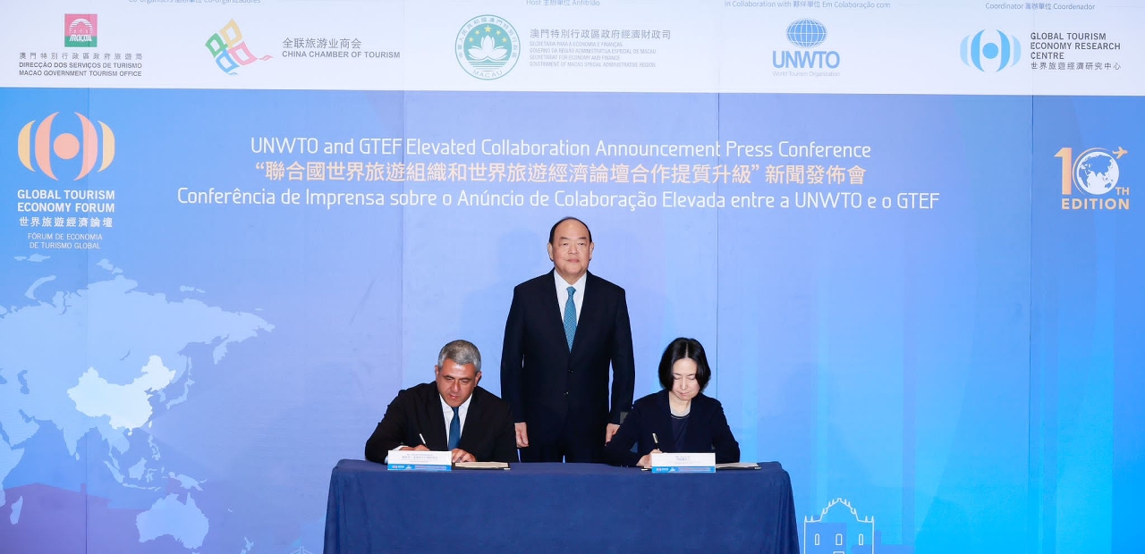 “联合国世界旅游组织和世界旅游经济论坛合作提质升级”新闻发布会上,在澳门特别行政区行政长官贺一诚见证下,联合国世界旅游组织秘书长祖拉布•波洛利卡什维利和世界旅游经济研究中心主席何超琼代表签署框架协议,标志着双方合作进一步升级。