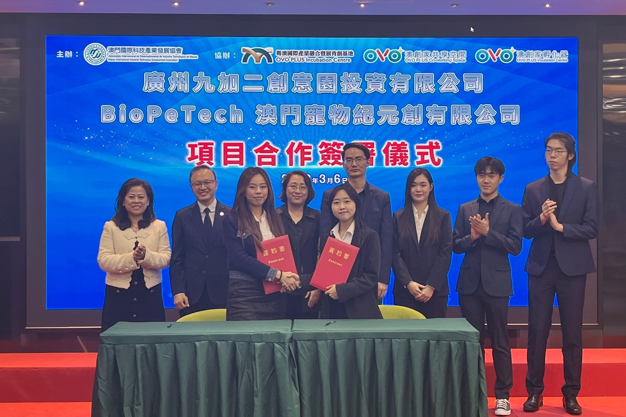 澳门大学郑裕彤书院创业团队与广州九加二创意园投资有限公司签署战略合作协定。该公司旗下于南沙的OVO PLUS澳创家孵化器将向书院创业团队提供资源、配套和优惠,帮助团队将产品推广到粤港澳大湾区。