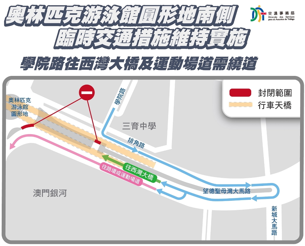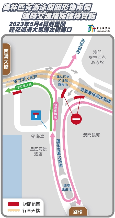 配合奥林匹克游泳馆圆形地行车天桥西南匝道桥建造工程,圆形地南侧自4月8日起临时封闭,周边道路正实施临时交通安排。因工程推进,由5月4日(周四)起,莲花海滨大马路左转往西湾大桥方向之行车道将恢复开放,车辆可恢复经由圆形地左转往西湾大桥;而莲花海滨大马路近銆海湾位置左转往东亚运大马路之内路会同步改为无出口道路(详见附图)。