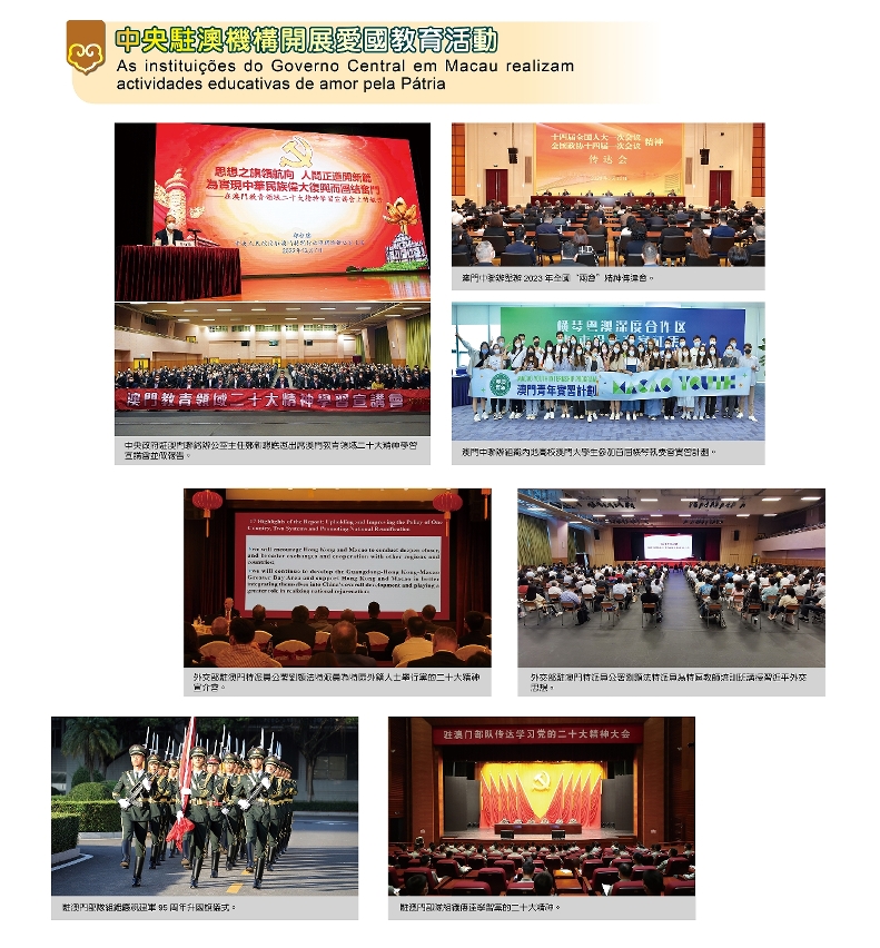 澳门中联办、外交部驻澳门特派员公署、解放军驻澳部队持续举办形式多样的爱国教育活动;同时,中资企业在积极保障澳门民生经济的同时,也开展了各种爱国宣传活动。