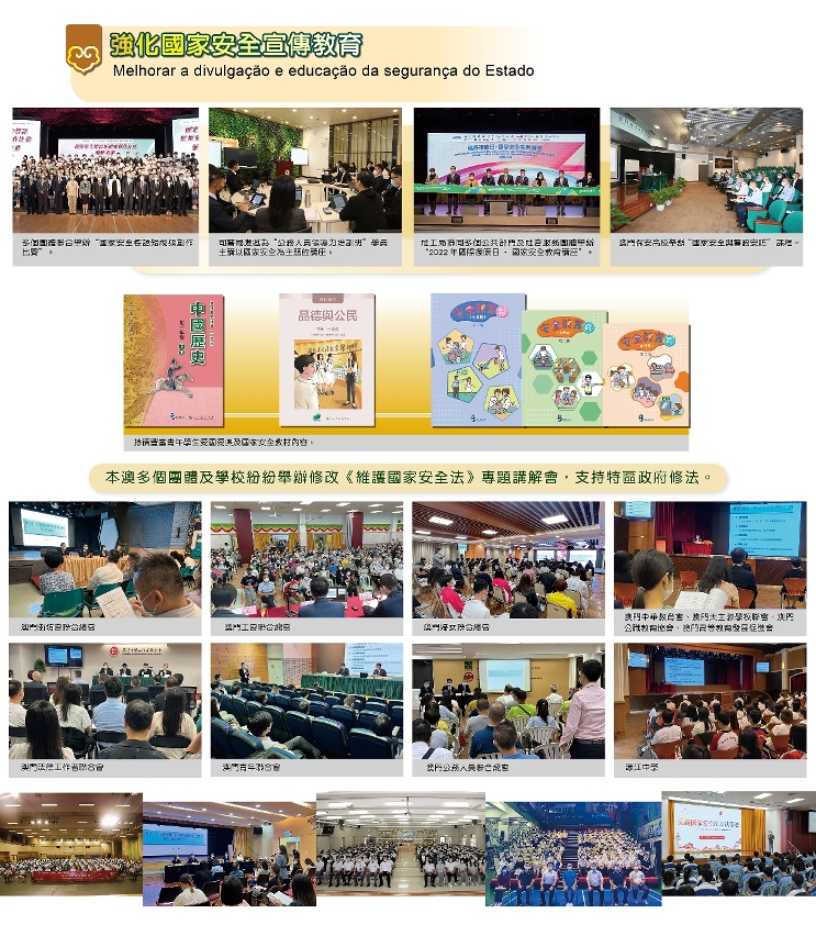 强化国家安全宣传教育方面,特区政府多个部门联同社会团体广泛开展多种宣传教育活动,此外,教育部门计划推出中、小、幼的国家安全教育补充教材。修改《维护国家安全法》公开咨询期间,本澳多个团体和学校相继举办专题讲解会,支持特区政府修法。