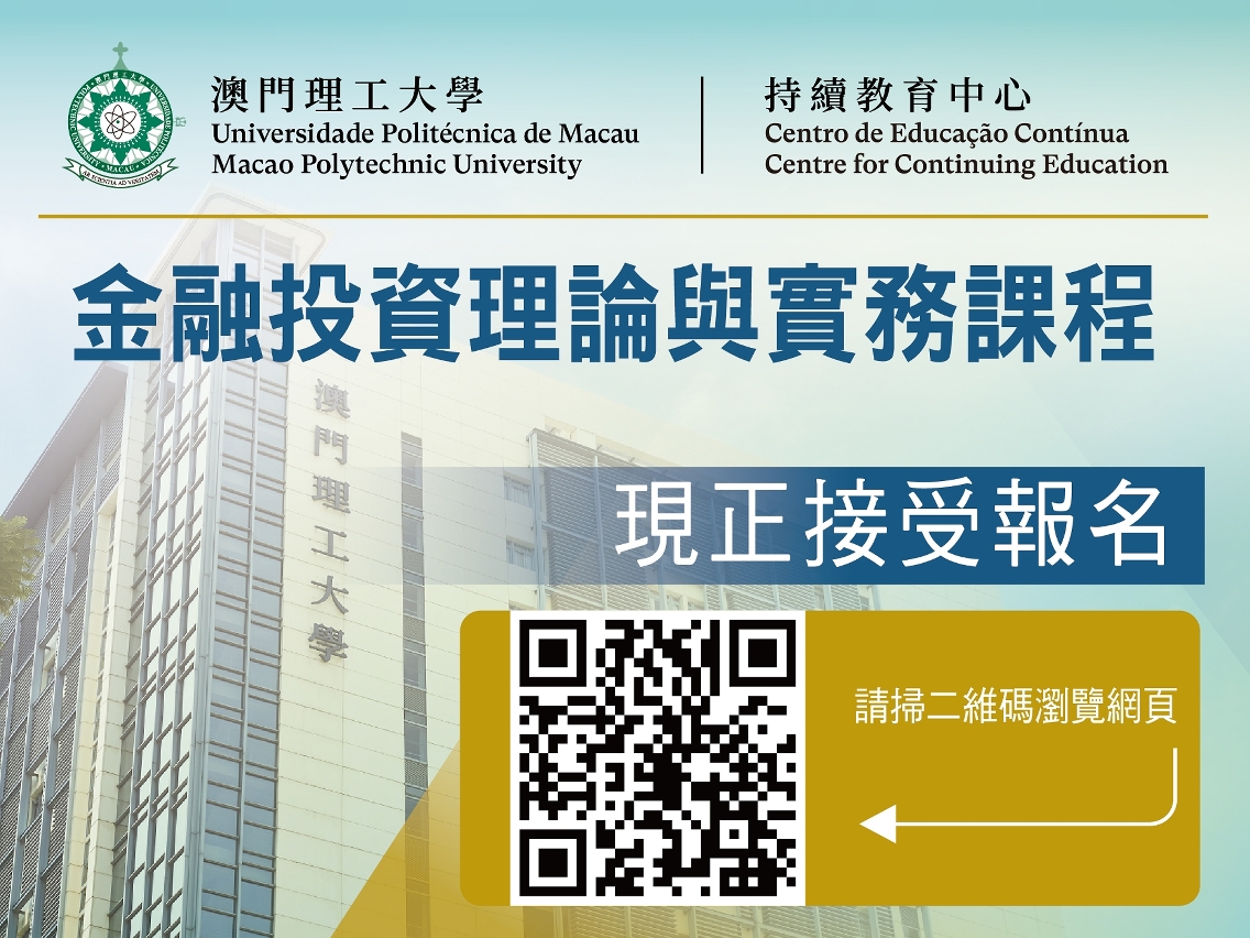 “金融投资理论与实务”课程内容包括股票、基金、债券、衍生工具等金融投资标的基础知识;证券投资入门所需关注的重要指标和实务;金融投资标的基础知识和风险成本控制策略等。课程以广东话授课,可使用教育及青年发展局持续进修发展计划个人进修帐户支付。出席率达总课时85%可获由澳门理工大学持续教育中心发出的证书。