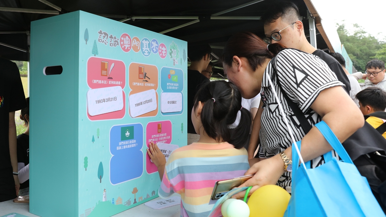 由法务局、市政署、教育及青年发展局和澳门基本法推广协会合办纪念《中华人民共和国澳门特别行政区基本法》颁布三十周年—“我与基本法”亲子普法同乐日,今(21)日于路环黑沙临时绿化休憩区举行。