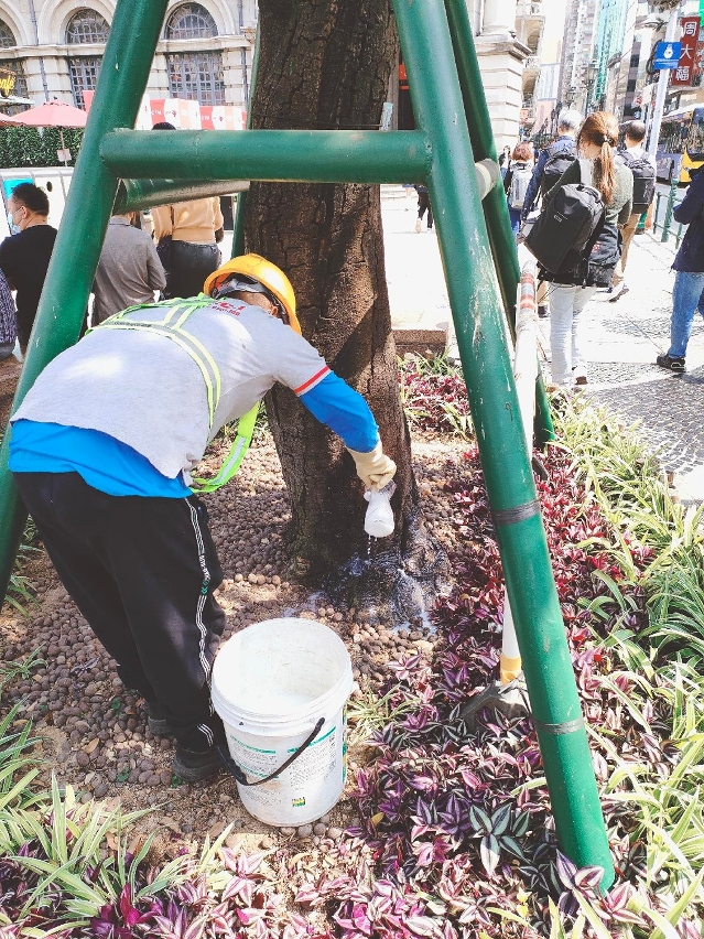 市政署持续巡查本澳街道树木,以维护树木健康及公共安全。去年发现位于议事亭前地的一株阴香感染根腐病及遭白蚁蛀食为害,导致树木生长持续衰弱并出现树皮脱落情况。为使树木长势得以恢复,工作人员已为树木进行修剪、清除真菌子实体、施药、扩大树穴、安装支撑架等一系列救治工作,并定期对该树进行监测。