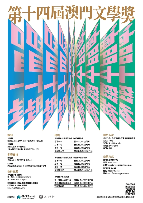 由澳门基金会及澳门笔会联合主办的第十四届“澳门文学奖”分本地组及公开组两组,本地组设散文、新诗、剧本、短篇小说及中篇小说五类,公开组设散文及短篇小说两类,每人每组限投两类,每类限投作品一份。当中,本地组中篇小说第一阶段现正接受投稿,截稿日期为2023年6月12日;其他类别将于2023年9月4日开始接受报名。