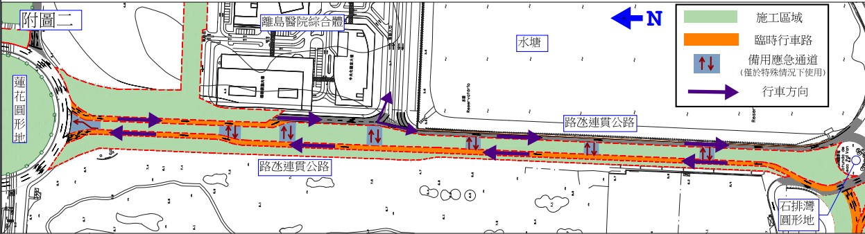于2023年6月29日至10月31日期间,南行线及北行线均实施单线行车。而在围封的施工范围内将适当设置备用应急通道以配合紧急情况时使用(详见附图二)。