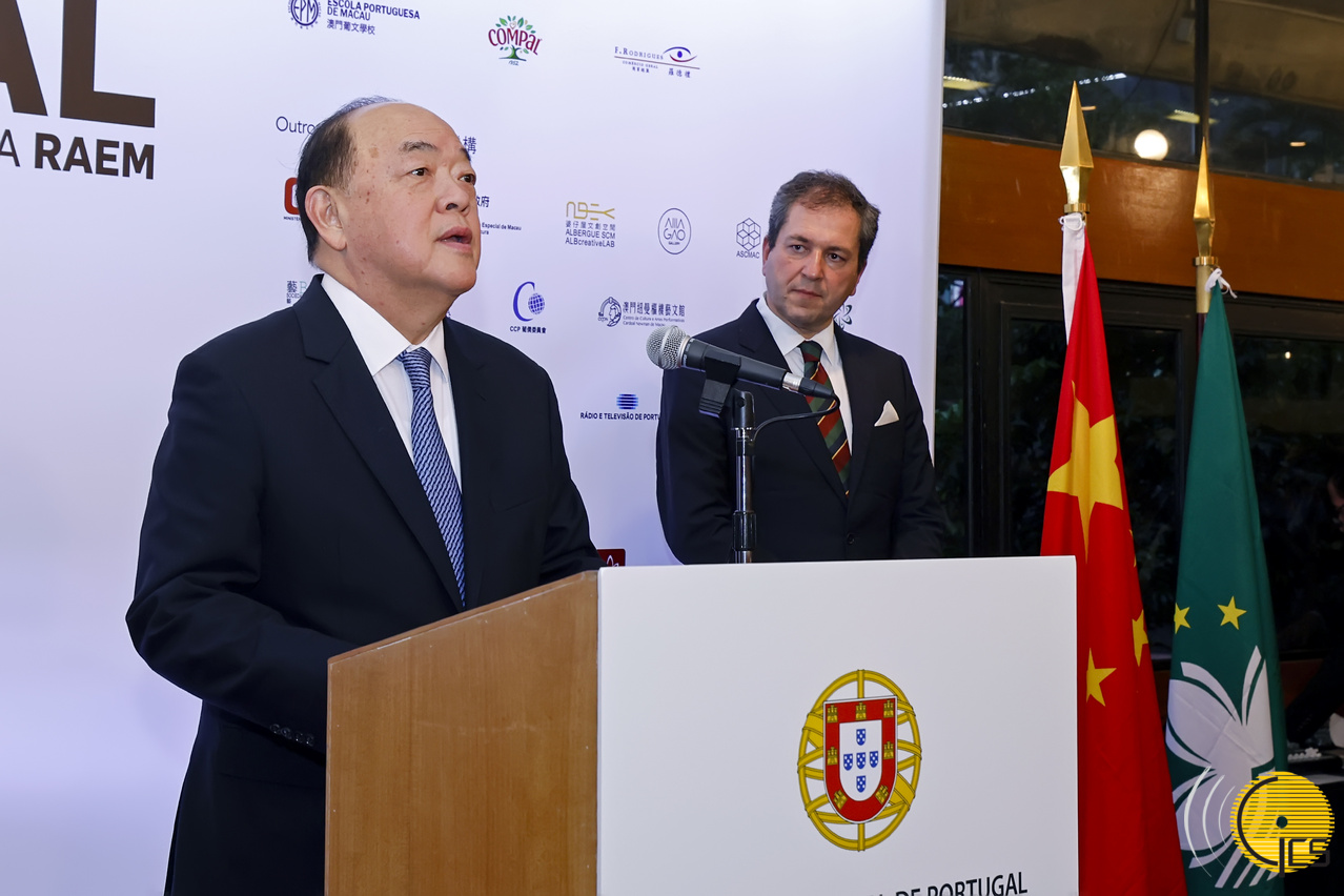 行政长官傍晚出席在澳门葡文学校举行的葡萄牙日、贾梅士日暨葡侨日庆祝招待会,他在致辞时首先代表澳门特区政府向葡萄牙人民和旅居澳门的葡籍人士、土生葡人致以亲切问候和诚挚祝愿。