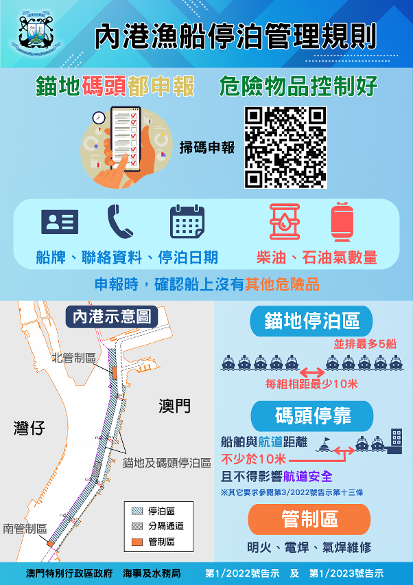 继去年刊登《告示》规管渔船锚泊内港锚地的安全应遵守则后,为进一步加强内港的渔船安全监管工作,局方今日刊登了第1/2023号《告示》,订明渔船停靠内港各码头的安全应遵守则,包括靠泊前须以电子方式申报,限制渔船靠泊码头时燃油的存放方式、设定石油气存量上限,禁止明火煮食、进行明火的祭祀活动和维修作业等。有关守则与现时渔船停泊内港锚地的要求基本一致。
